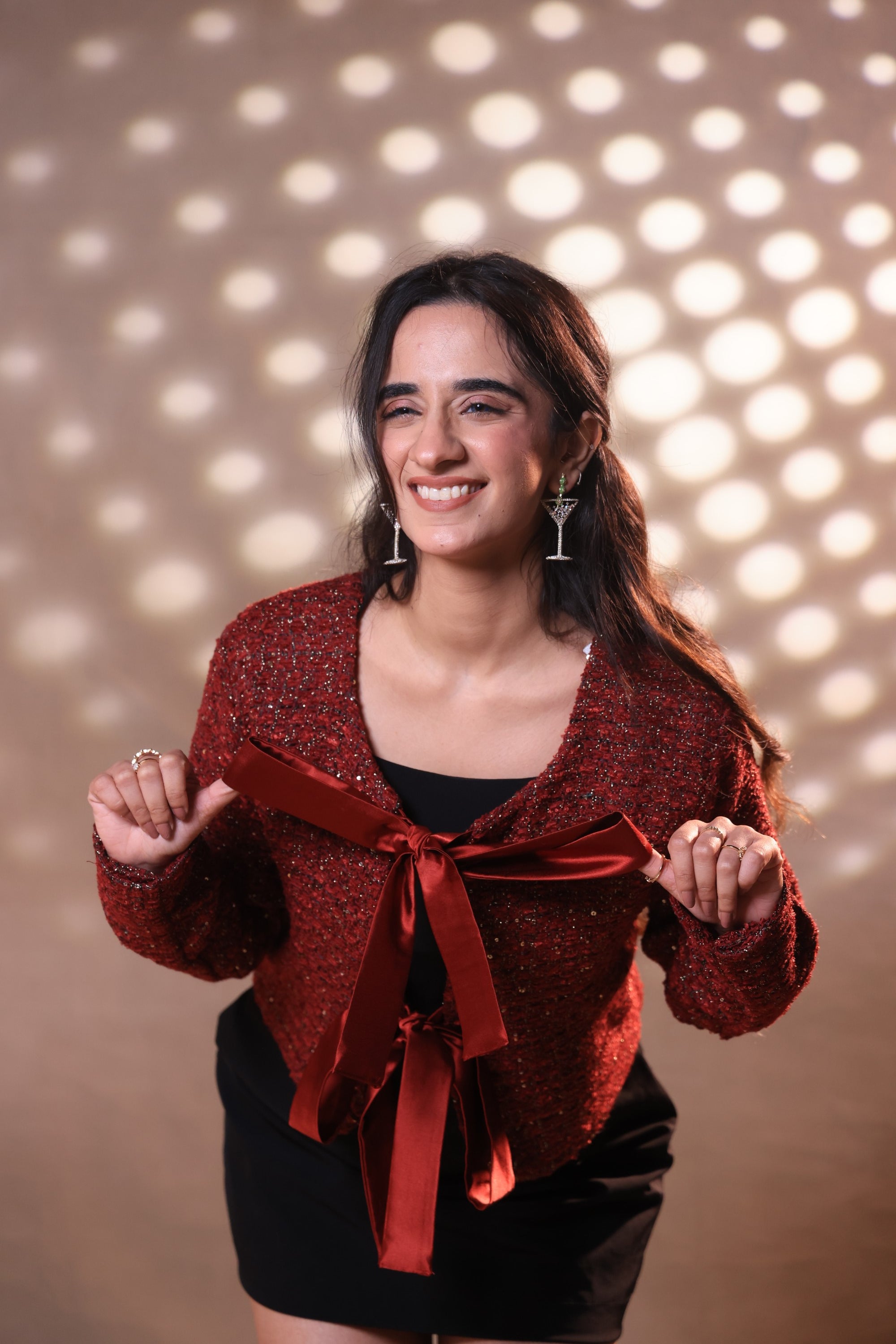 A refined blend of classic and modern, this cropped tweed jacket in deep red features a beautifully textured finish and a soft ribbon front closure. Feminine, polished, and versatile—perfect for elevating everyday or occasion looks.