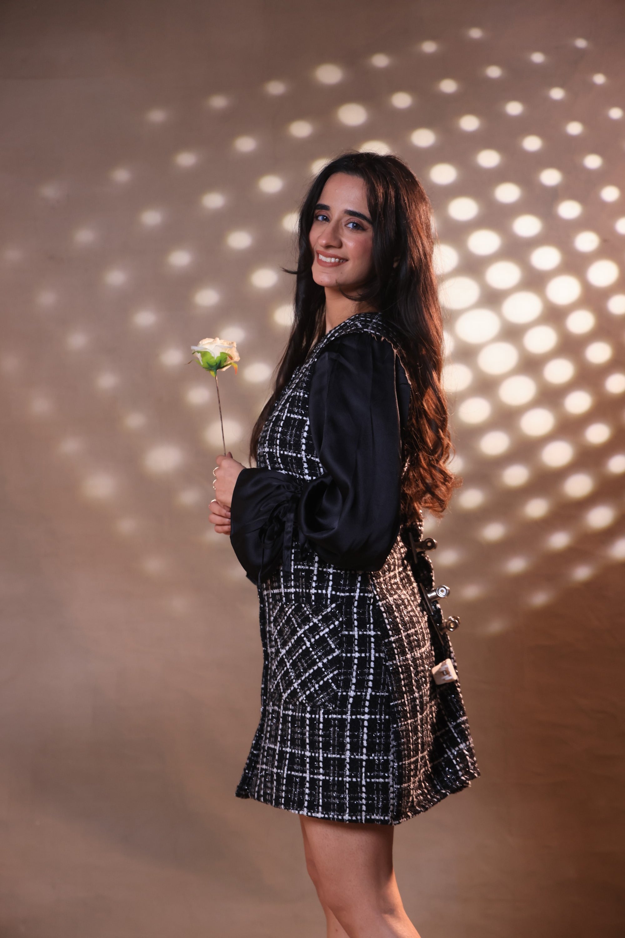 Crafted from textured tweed, the silhouette is clean and tailored, offering a flattering fit that transitions effortlessly from day to night adorned with matified metal buttons The standout feature: luxurious satin sleeves, delicately ruched for soft volume and a touch of refined drama.