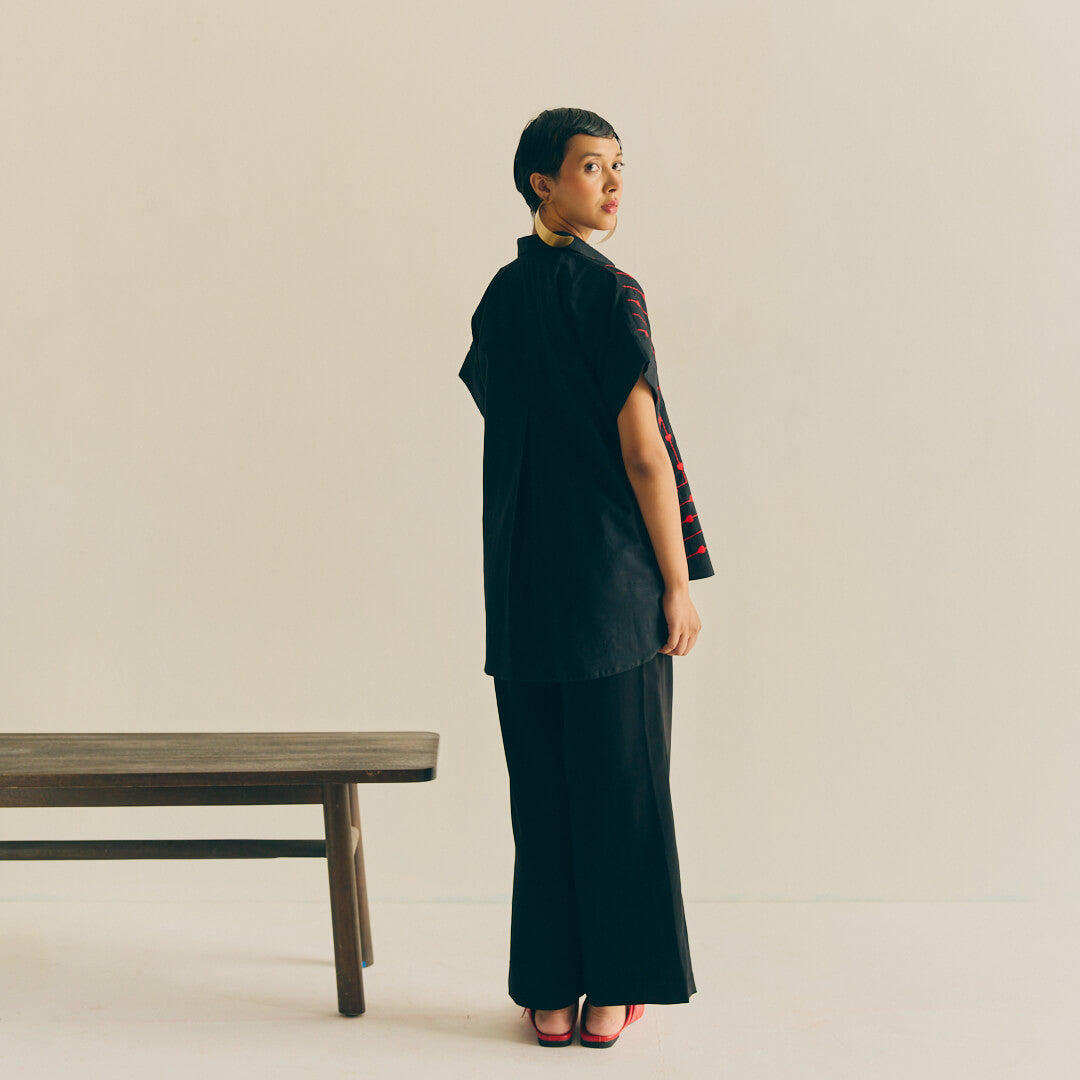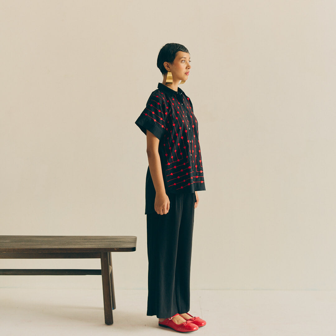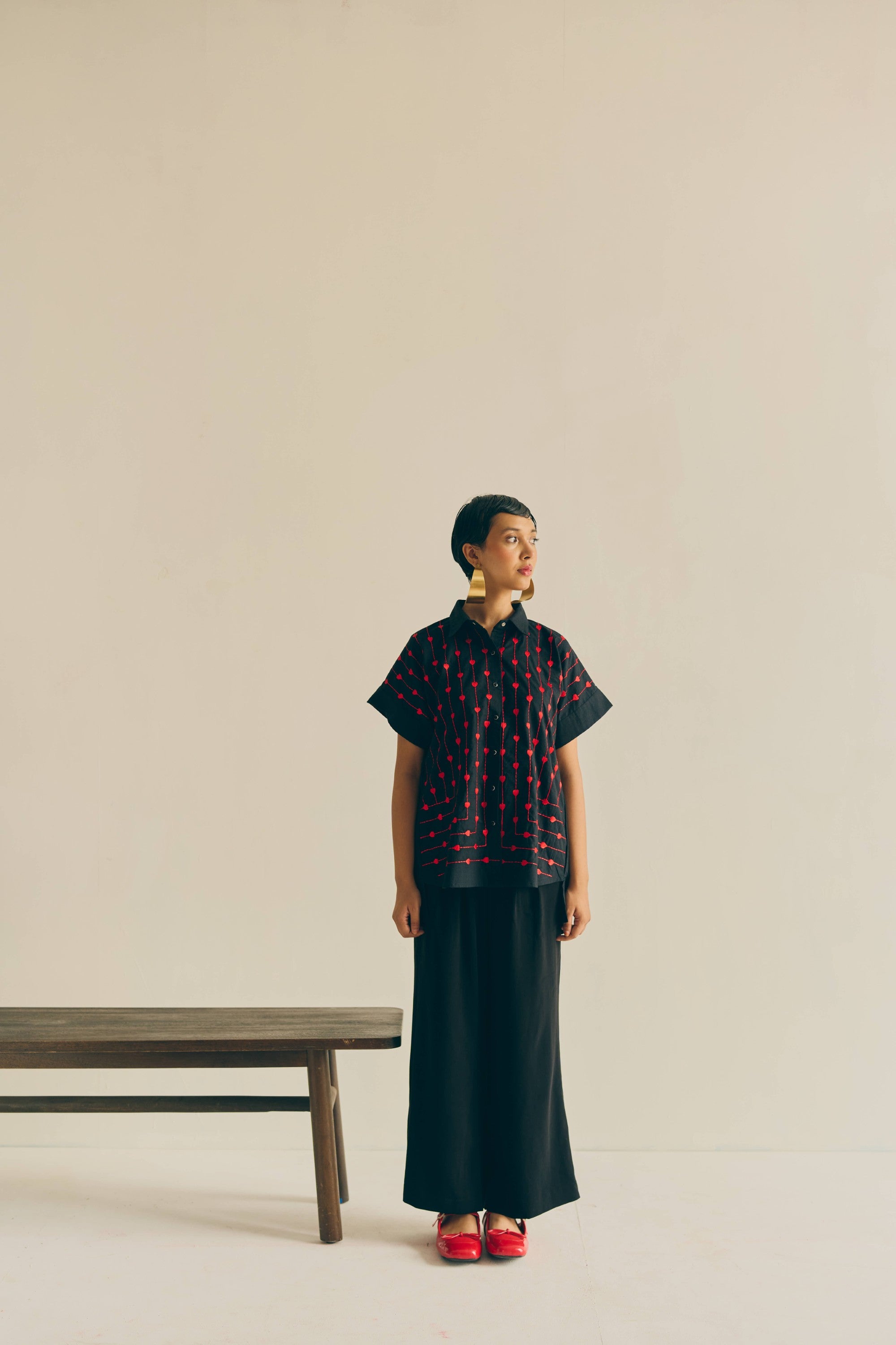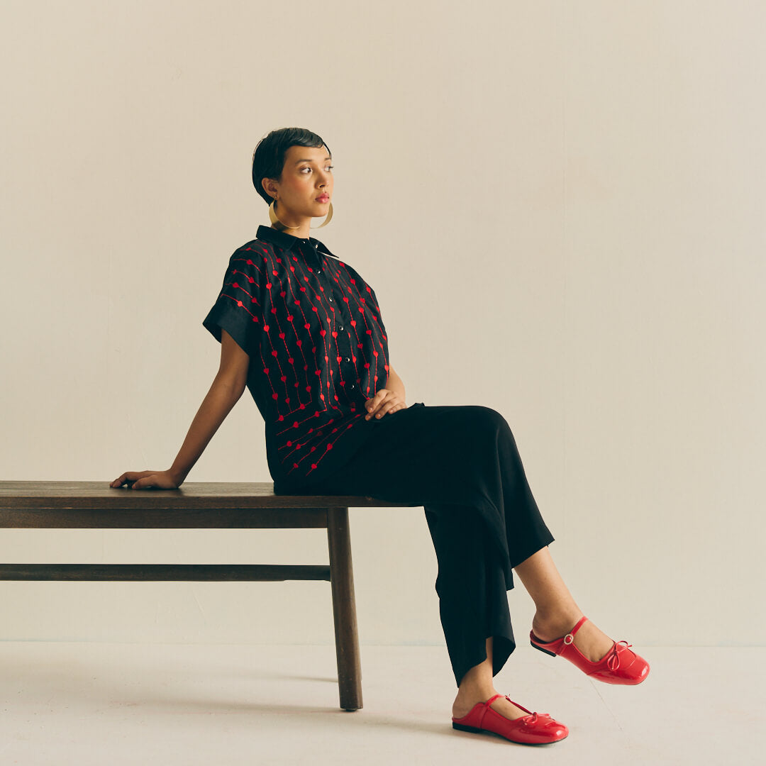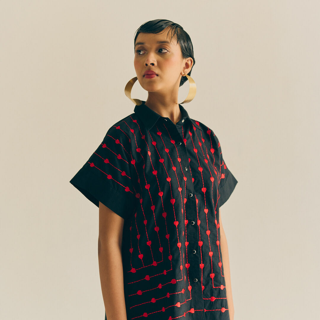 Chic kimono-sleeve poplin top adorned with delicate embroidered heart motifs, featuring a smooth snap-button front closure for a blend of elegance and everyday comfort.