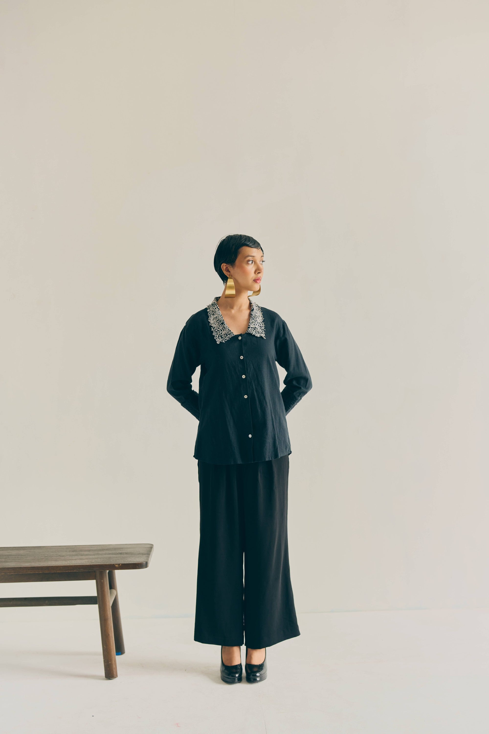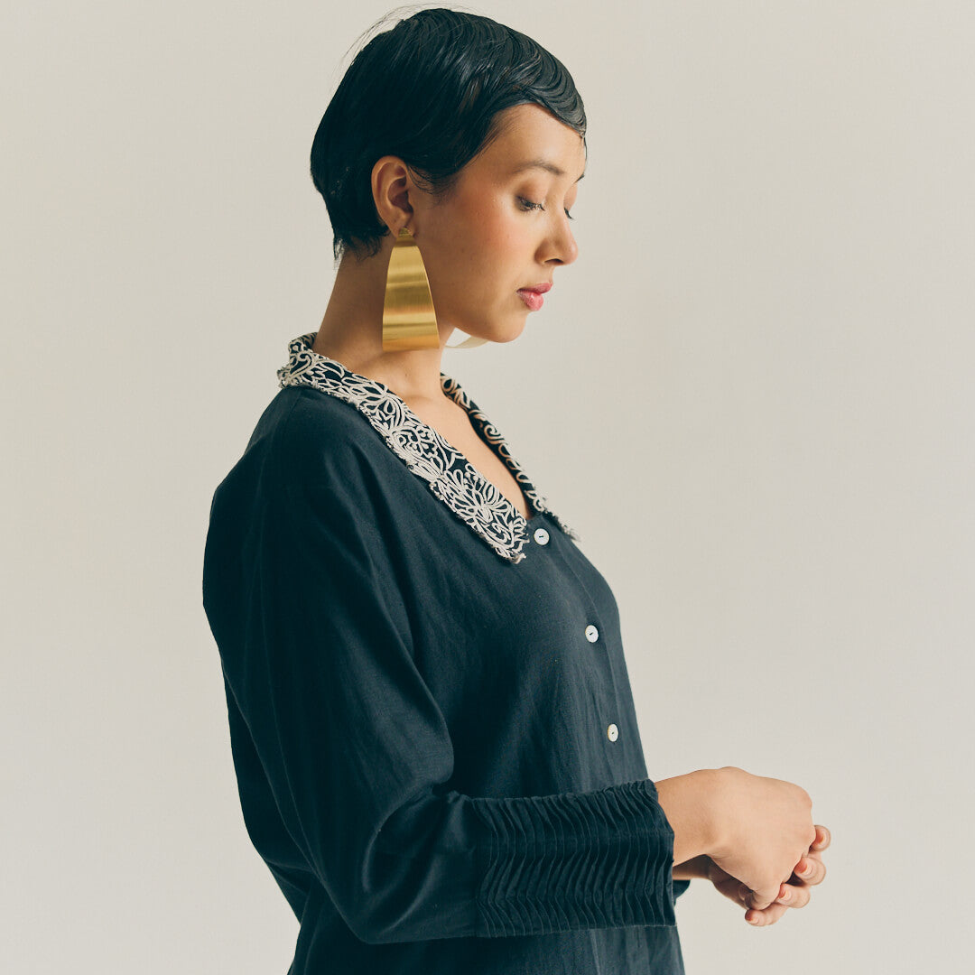 Refined linen shirt featuring an intricately embroidered collar and smocking detailing on the sleeves, blending classic tailoring with artisanal charm.